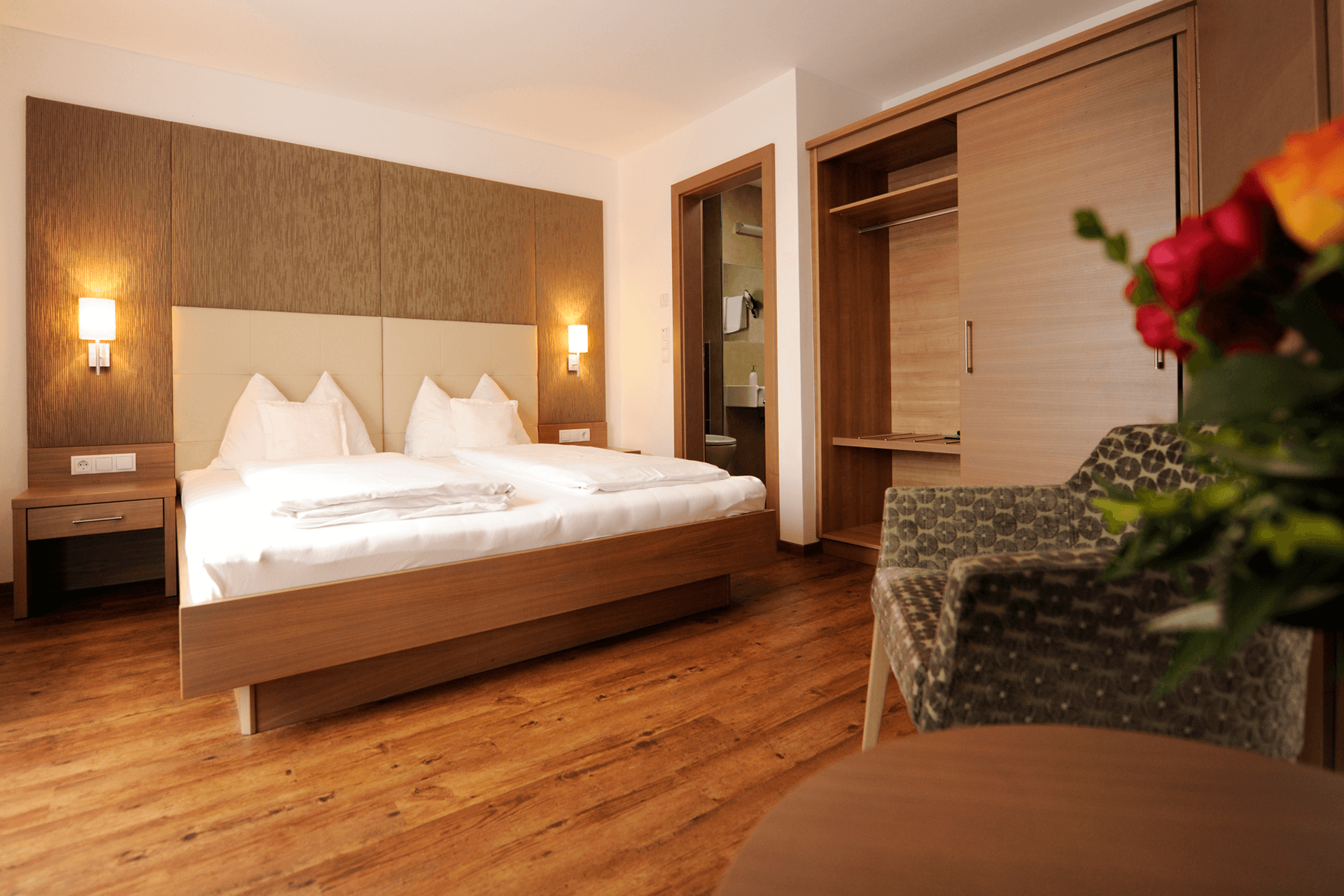 [pbr_title_heading title=”The hotel” descript=”Alongside culinary delicacies and excellent wines, our Rosenhof also offers fabulous accommodation. Choose between 17 tastefully decorated rooms, designed to guarantee a relaxing stay.