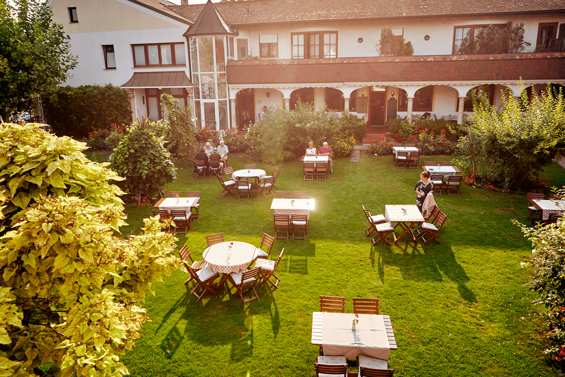 A particular highlight is our rose garden where, during good weather, you can sit and enjoy our culinary treats.”]