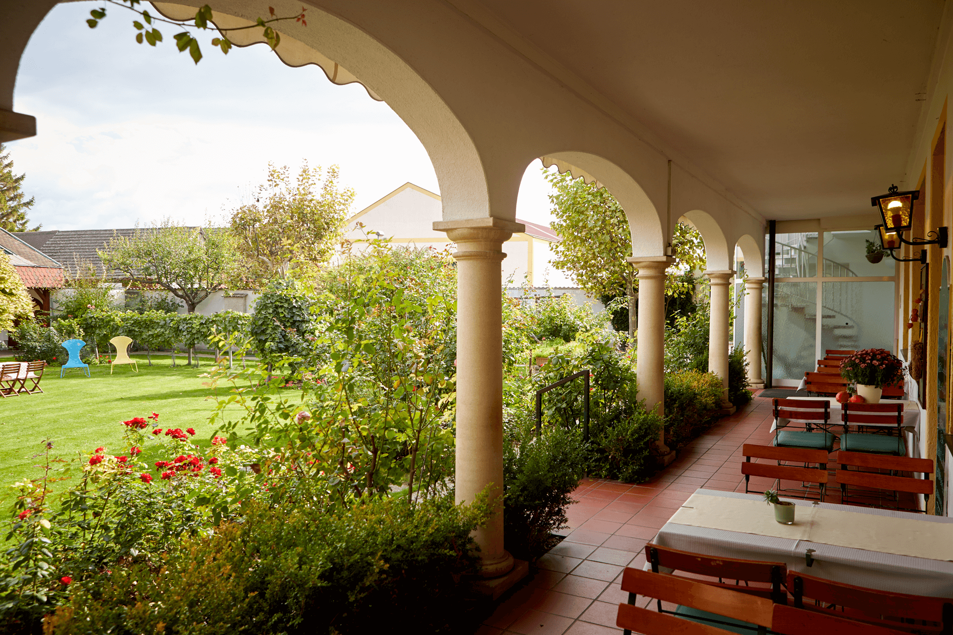 A particular highlight is our rose garden where, during good weather, you can sit and enjoy our culinary treats.”]